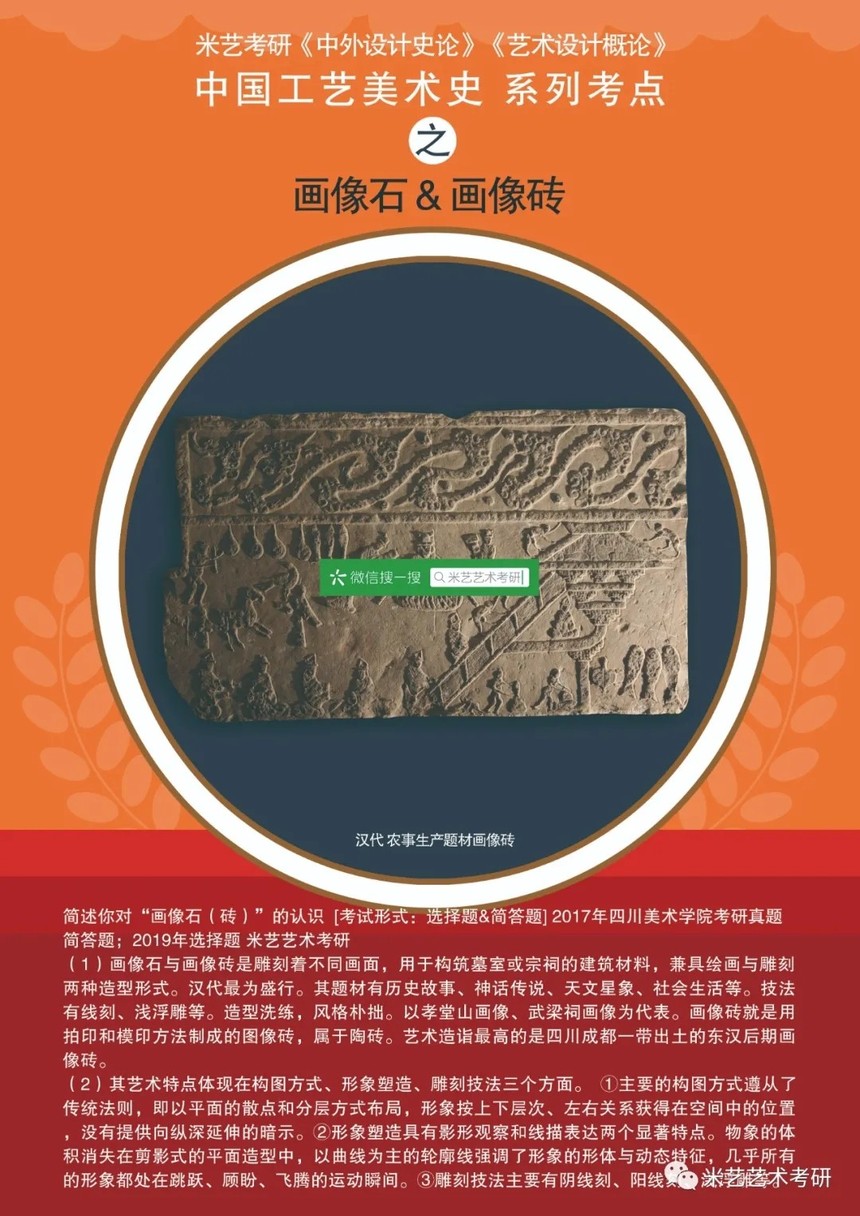 真题备考@画像砖丨米艺艺术考研《中外设计史论》核心考点云课堂讲解时间:2020-09-01 该知识点为:2016年四川美术学院《614中外设计史论2》考研真题: 1.汉代的砖瓦具有很高的艺术价值,最有特色的是画像砖和瓦当。(米艺艺术考研)汉画像砖的产地以(河南、四川)最有特色。 2.画像砖艺术性较高,有空心砖和方砖两种。空心砖又称圹砖,多流行于河南和山西,南阳地区出土最多;方砖,多为四川成都地区所产。 3.六朝的画像砖较汉代富于人间生活情趣,(米艺艺术考研)也渗入了佛教的宗教色彩。汉朝画像砖多为一砖一画,六朝时期的画像砖成为整体性和主题性的大型砖印壁画。河南邓县画像砖表现出一种特殊风貌的装饰效果,具有六朝时期清瘦飘逸的时代艺术风格。 4.南京“竹林七贤和荣启期”画像砖反映了(米艺艺术考研)以下两点:A.以名士为主题。B.山石树木的题材已经显出它的装饰地位。 5.代表性地区画像石(砖)表现的内容及技法特色。